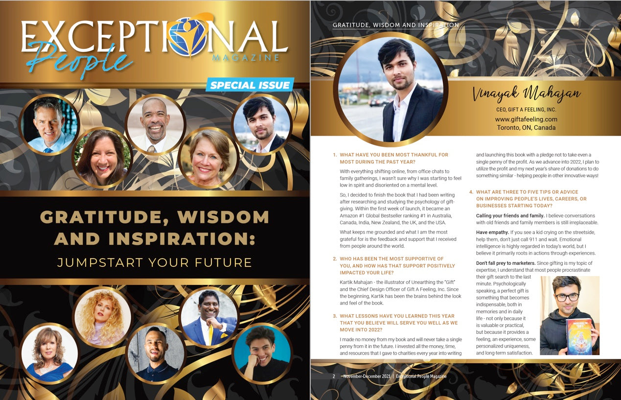 With everything shifting online, from office chats to family gatherings, I wasn’t sure of why I was starting to feel low in spirit and disoriented on a mental level. Luckily, from my past charity and volunteer experiences, it was deeply rooted in my brain how helping and serving people can lighten up one’s mood with gratitude and contentment. Thus, I took on the challenge to solve the #1 problem that the pandemic has fuelled - increasing depression rates and mismanaged relationships! Over 80 years of research conducted by Harvard University, proves how embracing community and healthy relationships can make people happier. With the holiday season approaching and being the founder and CEO of a personalized gift store, I had learned how gift giving can strengthen one’s relationships; consequently making both the giver as well as the receiver feel happier. However, although gift giving has a long history dating back to ancient times, one thing has continued to become more difficult - choosing a gift. Not only does this bring confusion and overthinking, but also tends to develop giftophobia, and I had sensed this overwhelming problem ever since I entered the gifting market. Therefore, I decided to finish the book that I was writing for the past couple of years after researching and studying the psychology of gift giving. Condensing all my experiences working with psychologists and conducting constant experiments, I finally was able to publish my book - Unearthing the “Gift”. Within the first week of launch, it became an Amazon #1 Global Bestseller ranking #1 in Australia, Canada, India, New Zealand, UK and USA. However, what still grounds me and what I am the most grateful for is the feedback and support that I received from random people around the world - people who’ve found the book helpful; people who found happiness by giving gifts and some who’ve enjoyed the illustrations in the book.