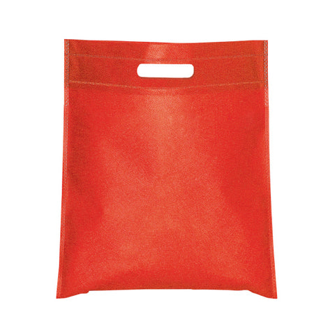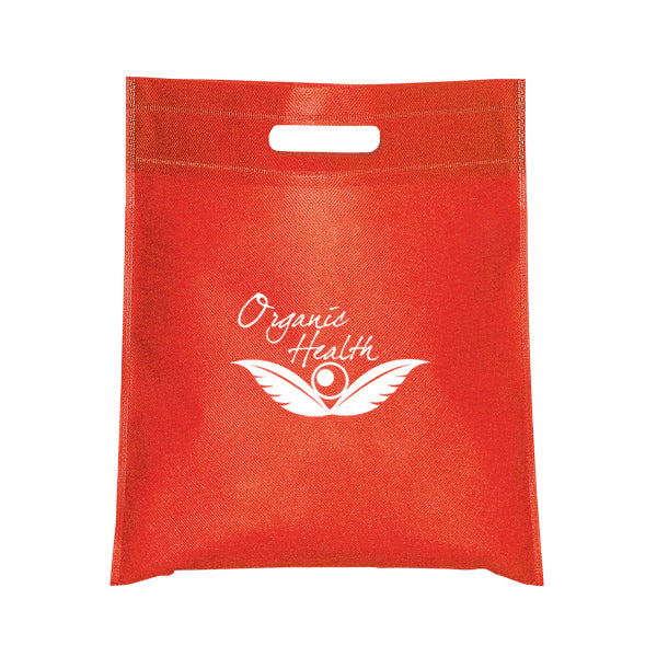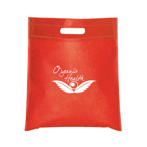 This 65 gram Non-Woven Tote Bag has a strong reinforced heat sealed seams Holds up to 2.5 lbs. (1.1 kgs.). Convenient cut-out handle. A durable alternative to gift wrapping those smaller items. Use at company events, trade shows & for corporate gifts. A lightweight alternative to use in retail stores, as handouts & to take the place of smaller plastic shopping bags. Complies with Prop 65. 11" W x 14" H