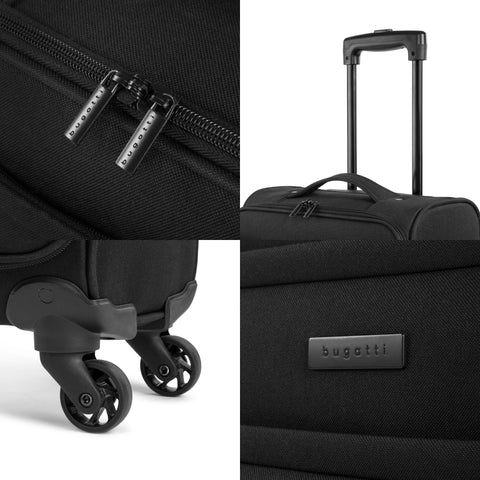 Lightweight and durable softside carry-on luggage. Easy to maneuver this polyester softcase carry-on features a telescopic trolley handle that locks in two separate positions and spinner wheels for precise control and smooth, quiet rolling. The inside of luggage has a dividing panel and tightening straps that help keep your clothes and personal belongings securely in place when on the move. 14.25" L x 7.5" W x 18.5" H