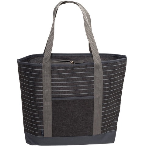 This striped tote bag is made of 600D Snow "Canvas" Polyester with PVC backing. Tote features gray stripes and accents that enhance the heathered tonal base. Recommended weight tolerance is 11 lbs. Polyester web handles measure (approximately 43"l x 1.18"w), and zipper pocket for extra storage (approximately 5.9"w x 6.2"h). Production time may vary due to imprint method. Complies with Prop 65. 18.25" W x 13.75" H x 4.25" D