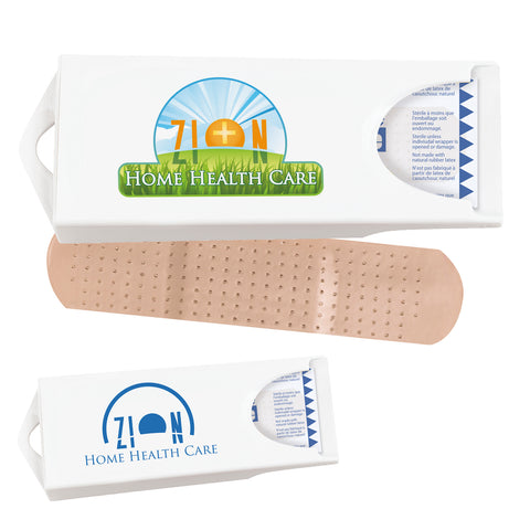 This practical white bandage dispenser includes five standard vinyl bandages. Stash it in your car, purse, desk, briefcase, or backpack for when those little emergencies pop up. 4.125" W x 1.5" H x 0.5" D