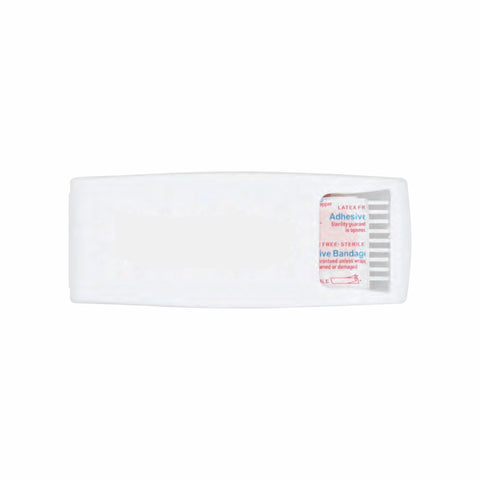 The plastic contoured rectangular pull-out bandage dispenser is a convenient and practical solution for quick and easy access to bandages. With its sleek design and grooved opening, the dispenser allows bandages to slide out smoothly with a simple pull. The dispenser includes 8 bandages, making it perfect for on-the-go first aid needs or for keeping in a bathroom or kitchen cabinet. The contoured shape of the dispenser makes it easy to grip and hold, and the durable plastic construction ensures that it will stand up to daily use. Whether at home, in the car, or at the office, this bandage dispenser is a handy tool to have on hand for any minor cuts or scrapes that may occur. . Please note that orders being shipped to the USA may be subject to additional Tariffs and Duties. 4" W x 1 5/8" H
