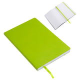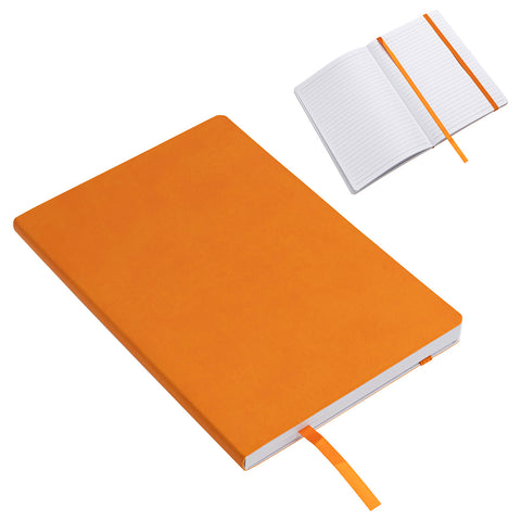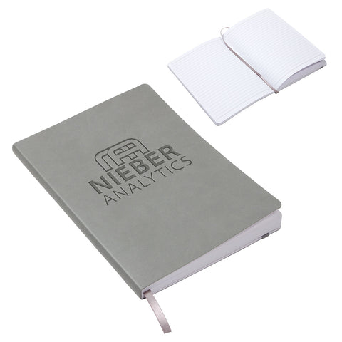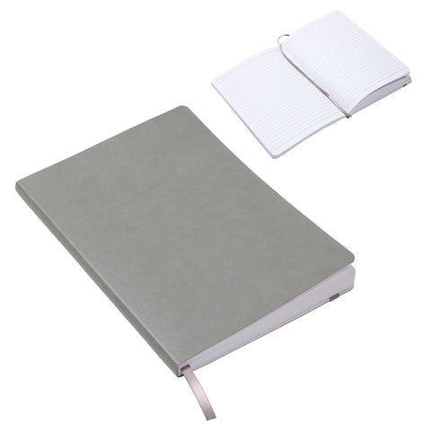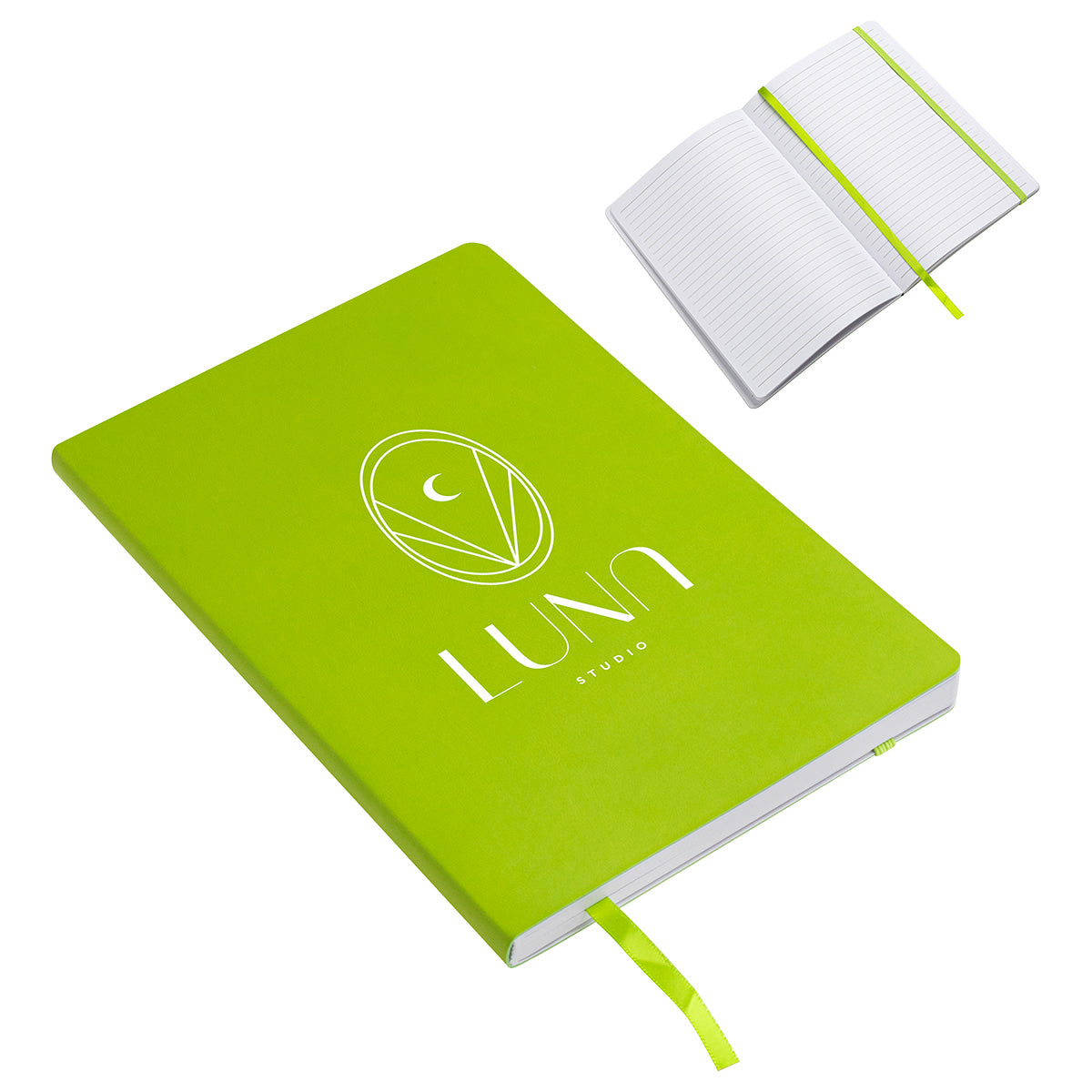 Solstice is a soft-bound leatherette journal with 80GSM white ruled paper, accordion pocket on inside back cover, color matched elastic closure and 80 sheets (160 pages) with color matched ribbon bookmark. Complies with Prop 65. 5.5" L x 0.5" W x 8.25" H