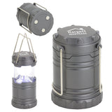 Unique retro design, 3 strong magnets on the bottom for work light function with a 44 lumen LED light that automatically turns on when top is pulled up. Handles fold neatly against side of lantern. This item is a mini version of the Retro Pop Up LED Lantern. Powered by 3 AAA batteries, inserted. Complies with Prop 65. 3.75" H x 2.5" Diameter