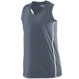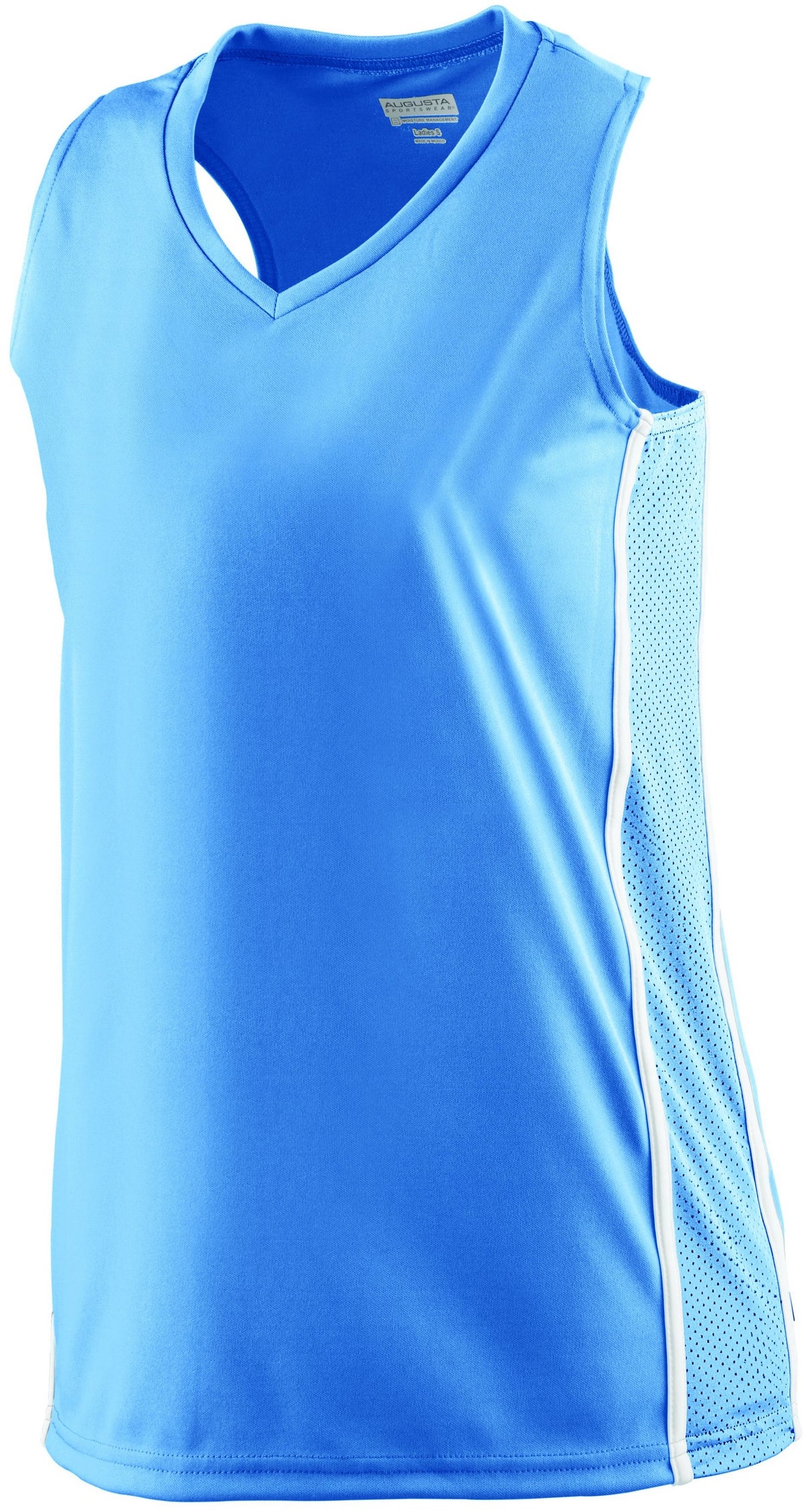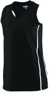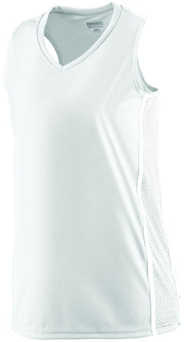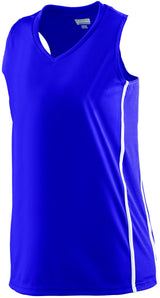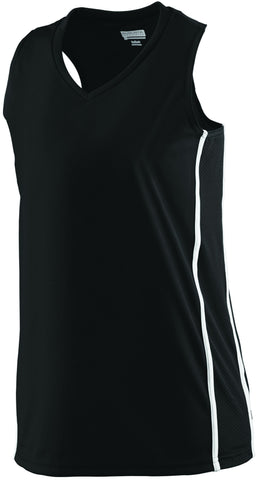 Keep the streak alive in the Ladies Winning Streak Racerback Jersey from Augusta Sportswear. Made with 100% polyester wicking smooth knit and v-neck collar, you can be sure to stay comfortable on the court. Two layers of 100% polyester wicking knit. 92% polyester/8% spandex pinhole mesh inserts. Please note, not all colors are available in all sizes. Complies with NFHS.