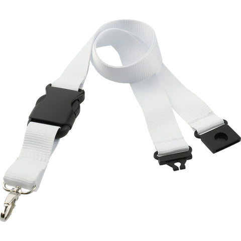 The Bullet Hang In There Lanyard is a 1-inch wide and 20-inch long lanyard with a breakaway neck clip. This versatile lanyard also includes a detachable plastic clip and a wide metal swivel hook. Use it to carry your badge, ID card, or keys. Second location setup and run charge waived if both sides are decorated with the same artwork. 0.03" D x 1" W x 20" H