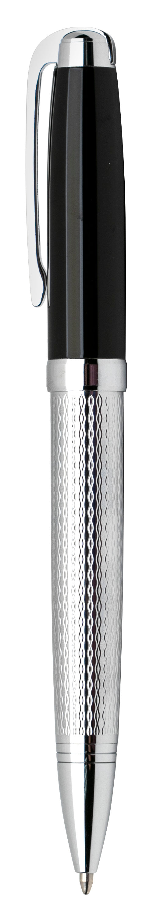 Executive twist-action ballpoint pen. Diamond cut textured silver metal barrel with black lacquered top and metal clip. Black ballpoint ink. Matte black gift box included. 5 3/8" L x 1/2" Diameter