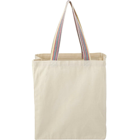 An instant upgrade to the regular cotton grocery tote is the Rainbow Recycled 6oz Cotton Grocery Tote. Made from pre-consumer recycled cotton, this grocery tote features rainbow webbing grab handles, and makes a perfect grab and go bag for the farmer's market or grocery store. 8" D x 13" W x 15" H