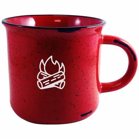 Campfire, 16oz large ceramic mug packed in an individual Ripple gift box. This mug with glossy red exterior and white hand speckled glaze is detailed with matching black rim and black 'distressed' patches. Volume of speckle varies from piece to piece. Each piece is unique. Recommended hand wash only. 3.75" H x 3.66" Diameter