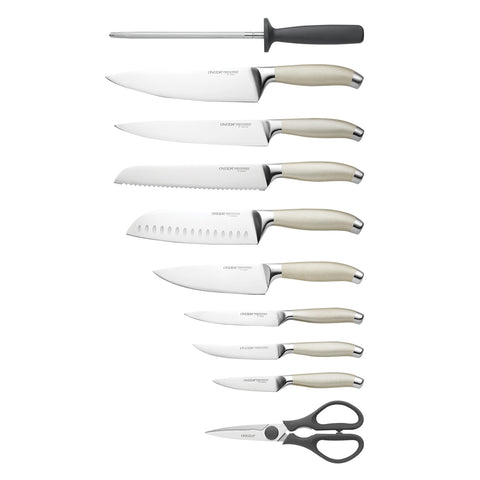 High quality Stainless Steel construction. Peened texture on comfort handles. Set includes 8" chef's knife, 8" bread knife, 8" carving knife, 7" Santoku knife, 6" chef's knife, 5" utility knife, (6) 4.5" steak knives, 3" paring knife, kitchen shears, honing steel, and a Hardwood knife block. Hand wash recommended. 25-year limited warranty. 8" D x 6.125" W x 14.5" H