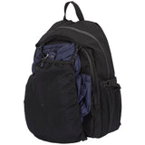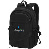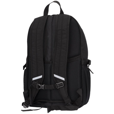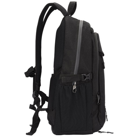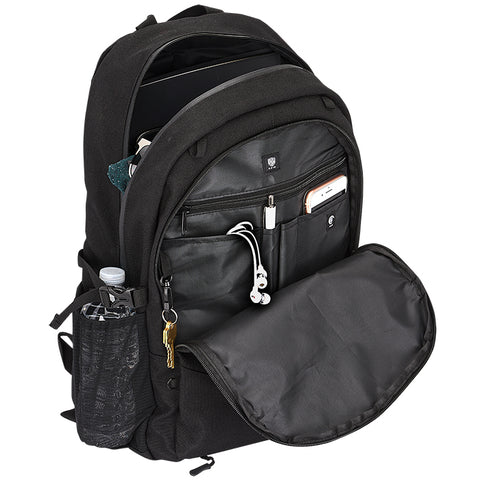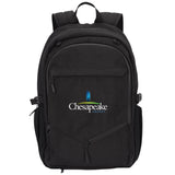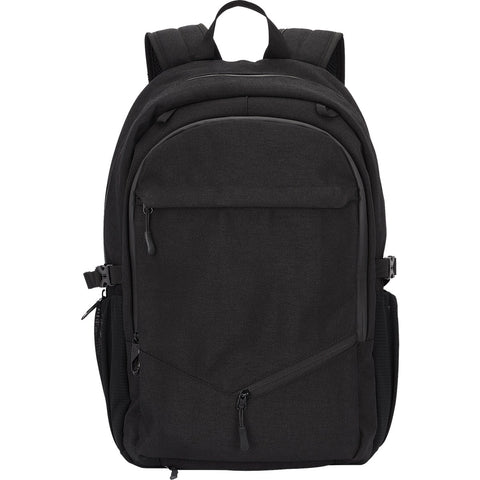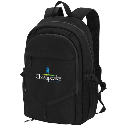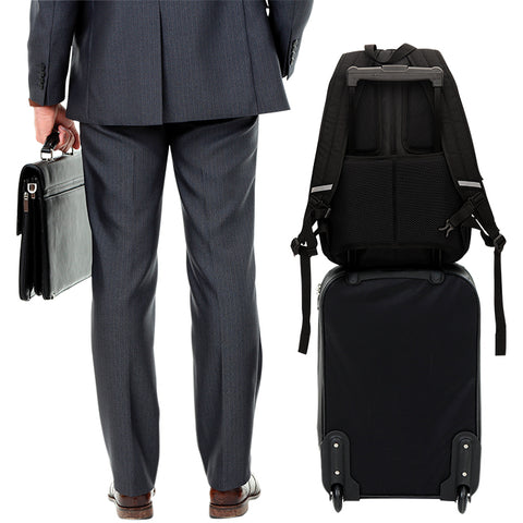 This backpack is constructed of 1000D water repellant Polyester with PU backing & two front zippered pockets, luggage strap, hidden cargo mesh with clips. Features include 2 side pockets, shoulder straps, padded back, sternum strap and top loop, Two security hook zipper heads with water resistant zippers, Main compartment features slash pockets (designed to hold a 15" laptop), tablet pocket and zippered pocket, RFID zippered pocket, key clip and simple organizer. 6.25" D x 14" W x 19" H