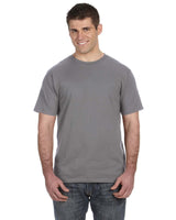 4.5 oz., preshrunk 100% combed ringspun cotton; 30 singles; Heather Grey: 90% cotton, 10% polyester; Heather colors and Neon colors: 65% polyester, 35% cotton; Graphite Heather: 50% cotton, 50% polyester; Seamed collar; Shoulder-to shoulder tape; Tubular construction transitioning to Side Seamed- mixed inventory may occur; Double-needle sleeve and bottom hem; Oeko-Tex® Standard 100 Certified; Tear away label; Anvil Black label tranistioning to Gildan Black label in 2022; Inventory may be mixed