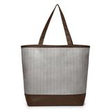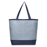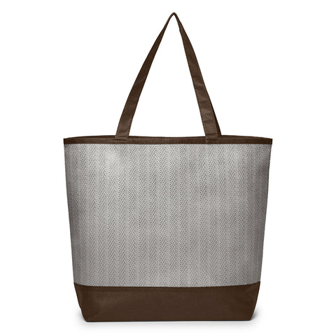This is a 70 and 80 GSM non-woven tote bag featuring our Delphine pattern textured non-woven main body with matching solid color base and handles. Other features include a large open main compartment and non-woven handles measure approximately 21". This Eco-responsible tote is an alternative to single-use plastic bags as its both reusable and recyclable. Recommended weight tolerance: 6.61 lbs. Complies with Prop 65. 17" W x 13.5" H x 4.72" D