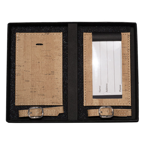 This gift set includes two Casablanca™ Luggage Tags in an elegant black gift box. The Italian PU luggage tag with cork-style finish gives a natural weathered look. The luggage tag features an adjustable strap and a silver-tone buckle. The strap secures a backside flap to conceal a business card or ID. Complies with Prop 65. 7.75" W x 6" H x 1.5" D