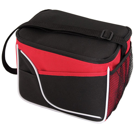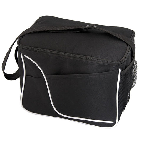 Inside white PEVA liner, zipper closure, adjustable/non-detachable webbed shoulder strap, side mesh pocket and two open front pockets. Holds six cans. Complies with Prop 65. 9.25" W x 7" H x 5.5" D