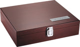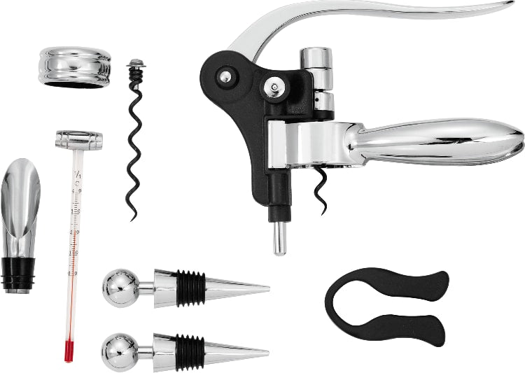 Nine-piece wine set features a cherry polished wooden case for compact storage. Includes an ergonomic bottle opener, foil seal cutter, drip ring, thermometer, pourer, two wine stoppers, and two replacement corkscrew bits. Complies with Prop 65. 2.75" D x 11" W x 9.75" H