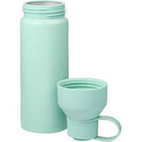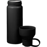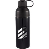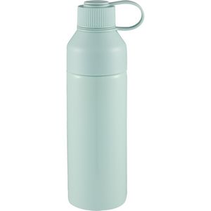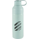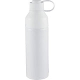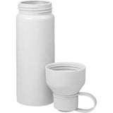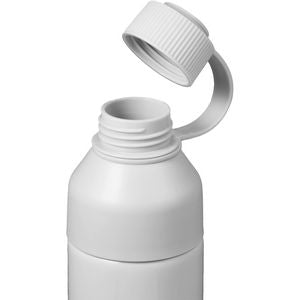 The DUO 26oz Sports Bottle features single-wall, 100% recycled aluminum construction with a unique double-opening lid design. The bottom of the lid screws the entire lid off the bottle, which is perfect for adding ice, easy filling and effortless cleaning. The smaller top-opening allows for easy swigging, screws tight for a leak-proof seal, and has a built-in handling loop for easy-carry convenience. 2.88" D x 3.74" W x 9.75" H