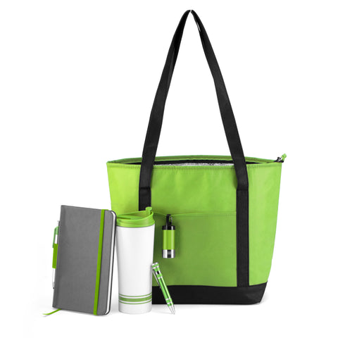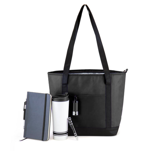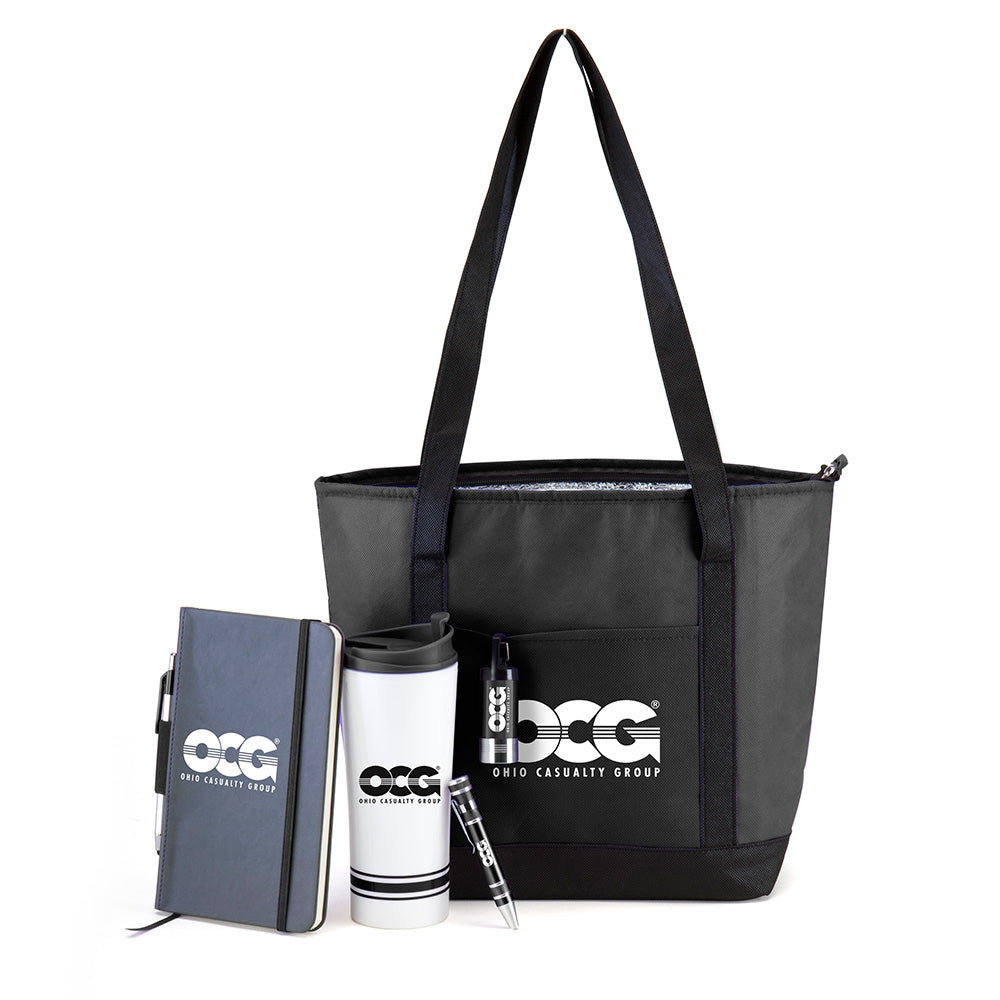 Newport Cooler Bag Gift set includes Tira Plastic Double Wall Tumbler, Chester Journal with stylus pen; Pocket Pal Aluminum Tool; and Rocket Flashlight.