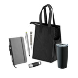 Gift set includes: Rocket Flashlight, Eat Right Cooler Tote, Chester Journal Notebook Set, Curvaceous Metallic Stylus with Highlighter, Backroads 20 oz. Tumbler, and Pocket Aluminum Tool Pen.
