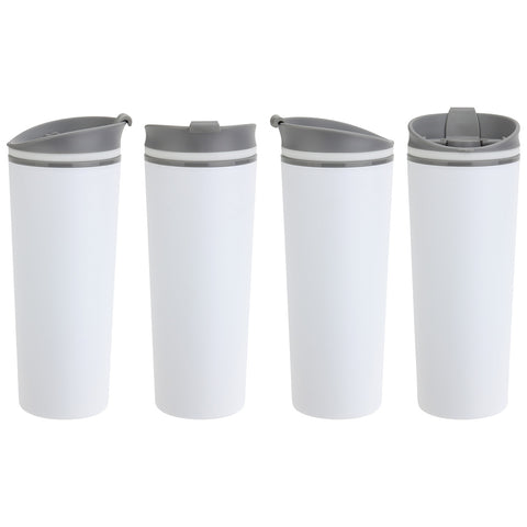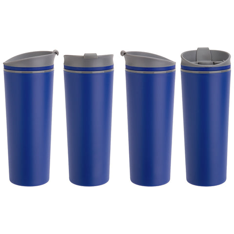 Commuter 17 oz Double-wall Polypropylene Tumbler with Flip Top Closure has a matte finish exterior with gray accent stripe that matches the grey inner lining and flip top closure, and fits most car cup-holders. Hand wash only. BPA Free and FDA certified. Complies with FDA, Prop 65. 8.5" H x 3" Diameter