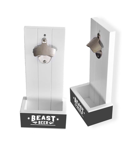Whether you've got a man cave, sports memorabilia area, basement bar or the genuine article – there's a place for this wall-mounted bottle opener. This rectangular opener has a stainless steel element with a wooden frame and area to catch bottle caps and other refuse. White only. Add your school, college, sports team, organizational or company logo, emblem or message to the base to create a dynamic branded piece of barware. Complies with Prop 65. 12" H x 5.5" W x 3.25" D