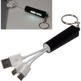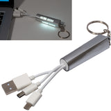 This duo USB charging cable key chain adapter has a light inside the main body that illuminates the logo while in use. Includes one USB Type C and duo 5pin+micro USB. Cables may be used for charging only (no data transfer function). Power/Technology: Input: 5V; Output: 1A; USB 2.0. This is not an Apple® authorized product, use at your own risk. Complies with Prop 65. 7" L x 0.5" H x 0.5" D