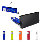 This compact multi-function bottle opener includes a corkscrew, and phone stand. It's made of ABS plastic and iron and is hand-wash only. Instructions included. Complies with Prop 65. 4.5" W x 1.125" H x 0.4375" D