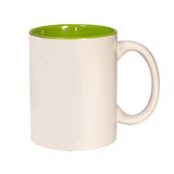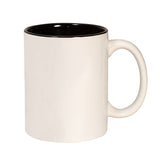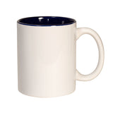 This two-tone 11 Oz. (325 mL) ceramic mug is a classic item for home and office and features a glossy white exterior and color interior. Hand-wash only. Do not microwave. Do not place in freezer. Dimensions include handle. Complies with Prop 65. 3.75" H x 4.5" W
