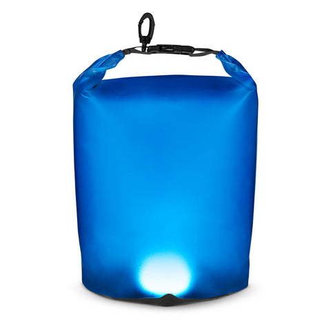 This PVC water resistant bag is designed to keep your property dry. The new design features 60 Lumen COB light to help you find what you need, even in the dark. It features a black plastic buckle closure that doubles and a handle for easy carry when the bag is full and sealed. For max protection from water, fill dry bag no more than 75%; press black Polyester edges together and squeeze out air; then fold top of bag down at least 3 times and snap buckles together. Takes 2 button cell batteries. Complies with Prop 65. 11" W x 14" H
