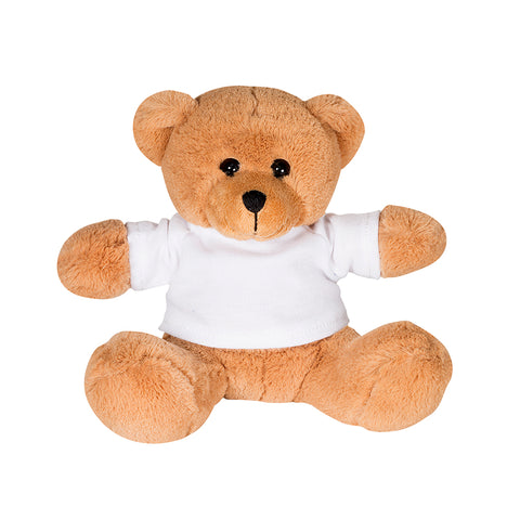 This is a adorable brown plush bear available in your choice of 9 t-shirt colors. Teddy bears feature logo on the t-shirt only. No decoration available directly on the plush animals. Surface washable only. T-shirts are 100% polyester. Toy safety tested to ASTM F963 specification. Complies with ASTM, Prop 65. 7.75" W x 7" H x 5.75" D