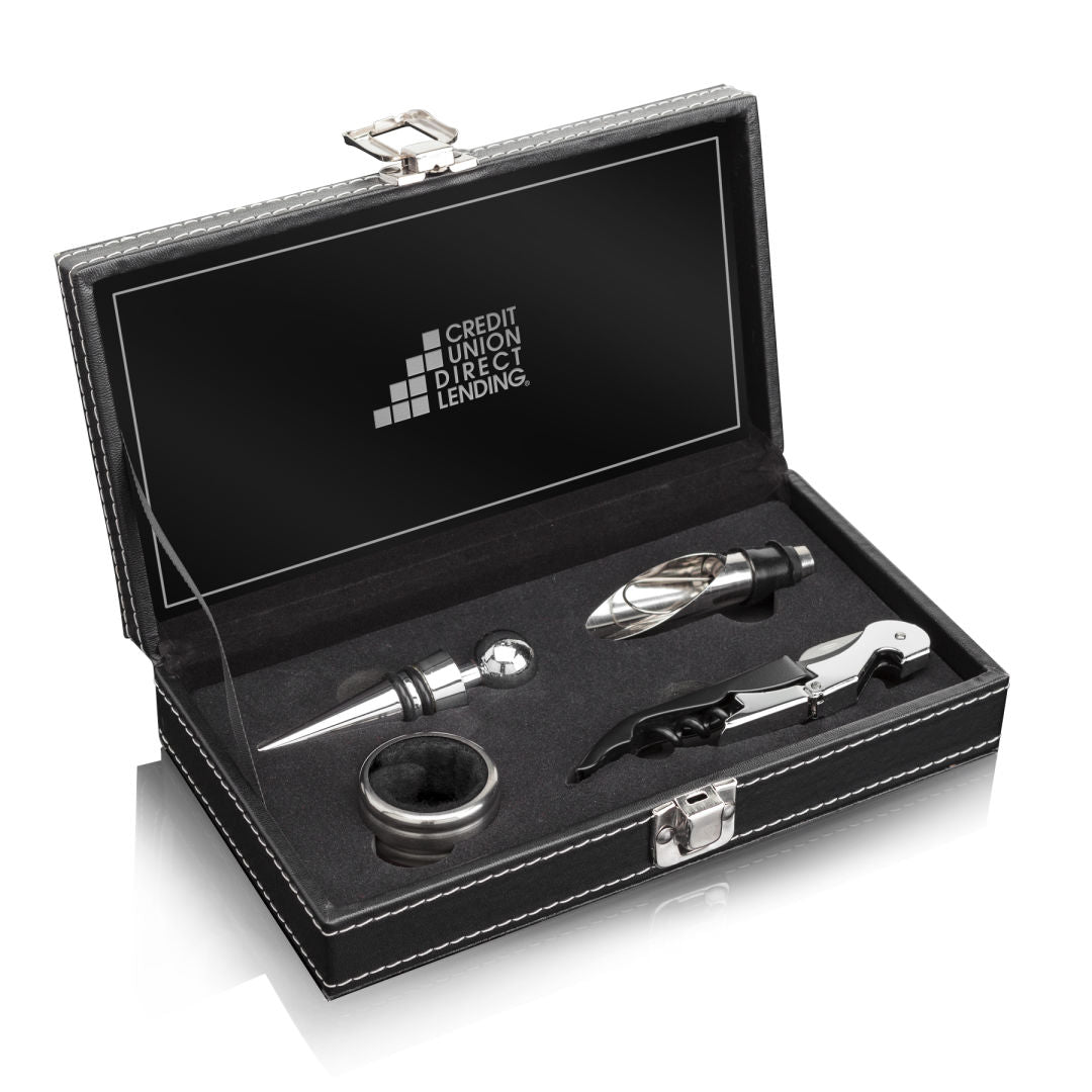 The Aikman Wine Set's padded insert holds a steel sommelier's knife, drip-stop ring, bottle pourer and a self-sealing bottle stopper in an elegant stitched & padded leatherette case with silver latch and black metal lid plate for your inscription.