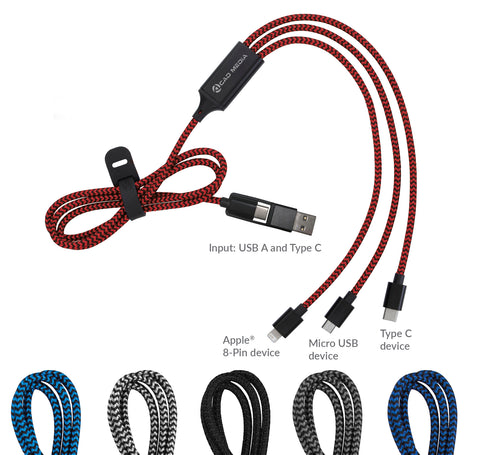 This hardworking charging cable has 3 outputs and comes with 2-way inputs (USB-A and USB-C) that fit most wall chargers. Measuring 3 feet with a maximum 2A output, you'll have ample length to reach the nearest outlet. .75" W x .375" D