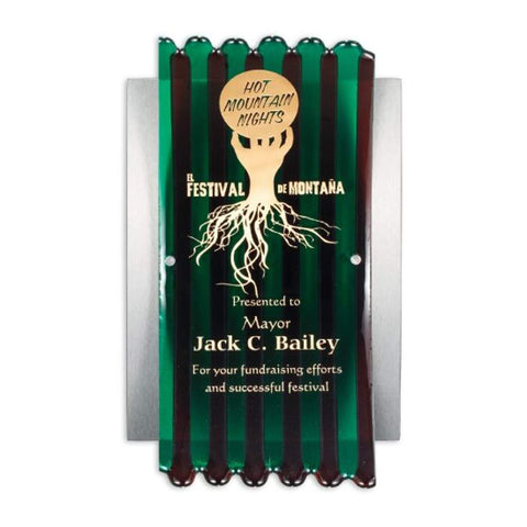 Arched and fused art glass in combinations of red & blue or green & brown are mounted to a brushed aluminum surfaced black wood plaque. Silver standoffs hold the art glass away from the surface and allow natural light to dramatically illuminate the plaque.