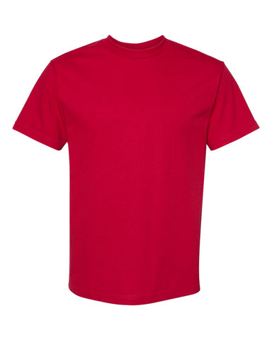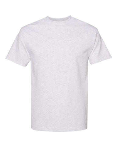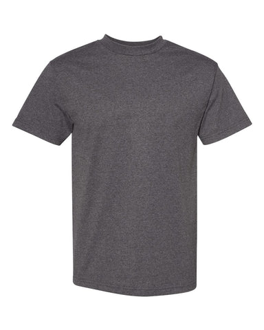 This Alstyle Classic Short Sleeve T-Shirt is 6 Oz., and has 100% preshrunk cotton. Safety green is 50/50 cotton/polyester, Ash is 99/1 cotton/polyester, Athletic Heather is 90/10 cotton/polyester. Features set-in rib collar with shoulder-to-shoulder taping, seamless double needle 7/8" collar, double-needle sleeve and bottom hem, nafta compliant, and tearaway label. Complies with Prop 65.