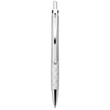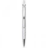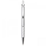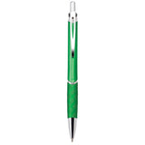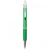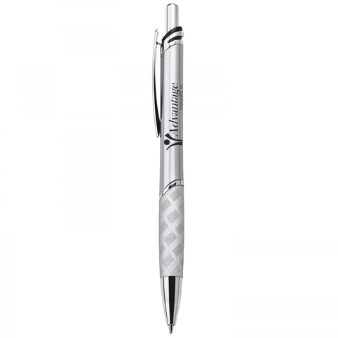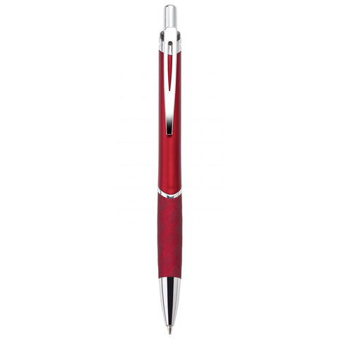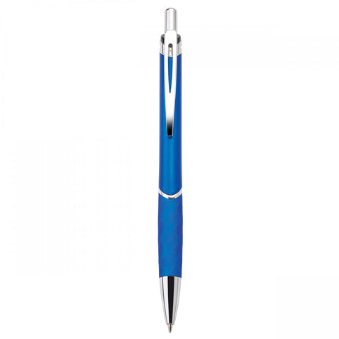 This heavyweight 18.5 grams push-action ballpoint plastic pen has a matte metallic finish, matching rubberized textured grip, chrome trim and a black accent. 5.7500" L x 0.0000" W x 0.0000" H