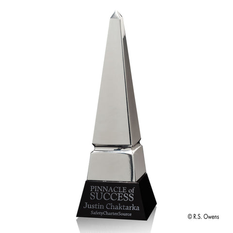 The classic obelisk shape is translated in hand cast metal and gleams with polished perfection. Mounted to a beveled ebony crystal base.