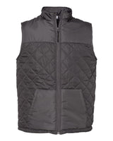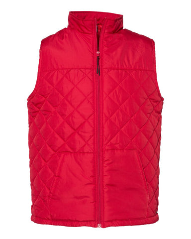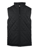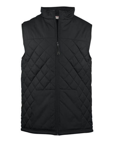 This Badger Quilted Vest is 2.1 Oz. and is made of 100% padded polyester fabric. Features quilted front and back body with smooth shoulder panels and pocket, its wind and water resistant, self-fabric collar with full length locking zipper, pouch pocket on front body with headset opening, bungee cord and hidden toggle on left side, drop-tail hem, and embroidered badger logo on lower left front body. Complies with Prop 65.