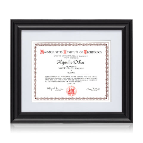 The dignified combination of rich black finished wood and thick white matte displays your certificate with contemporary grace and understated elegance.