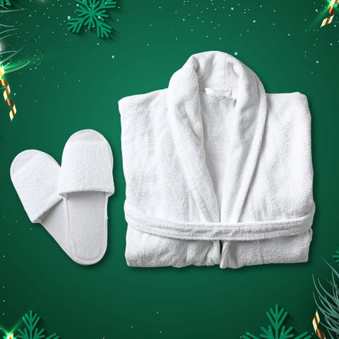 Perfect gift set for the winter holidays! Soft premium cotton velour material in both bathrobe and slippers. Have your employees feel nice and cozy while wearing your company branded robe and slippers. Also great for hotels, resorts, casinos, etc. Pricing includes up to 5k embroidery on the bathrobe and heat transfer on the slippers.