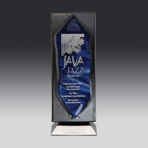 Fusing art glass is one of the hottest award trends. This award is fused with a pattern of metallic gold art glass and clear & black stringer art glass under intense heat to form three separate pieces of glass into one.