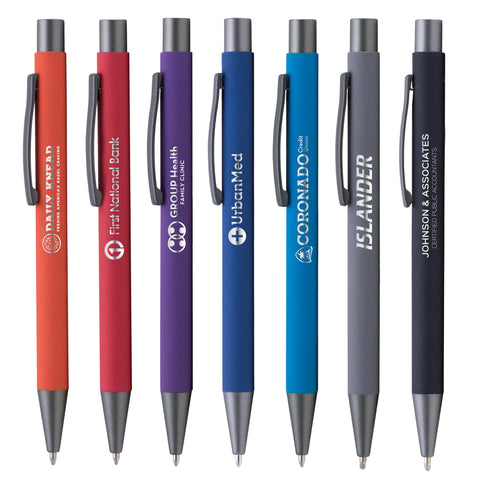 Elevate your promotional status with the Bowie Softy pen! This stylish pen features a trendy rubberized finish barrel, allowing you to write in comfort in any position, and a smooth writing high capacity cartridge, available in Black or Blue ink. Make sure you garner maximum attention with an imprint of your logo, company name, or marketing message on the soft colored barrel. A must-have writing utensil, choose this ballpoint pen to giveaway at banks, reception areas, fundraisers and much more! Complies with Prop 65. 5.37" L x 5.37" W