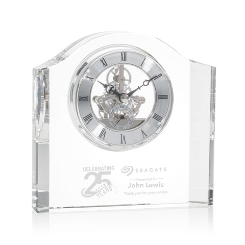 The Burchfield Clock is a thick Optical Crystal Clock with curved top and a classic mechanical clock face. A timeless gift that is sure to impress!