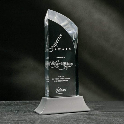 Uniquely cut acrylic on a satin silver finished Stonecast base.