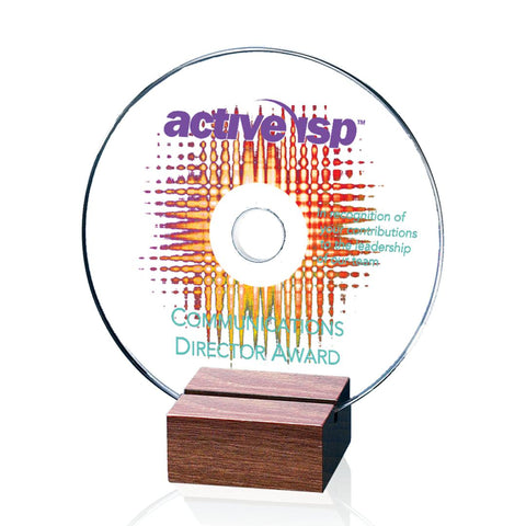 The CD Award, a 4½" diameter starfire or jade glass circle with a central spindle hole, is set into a slotted Black Walnut wood base.