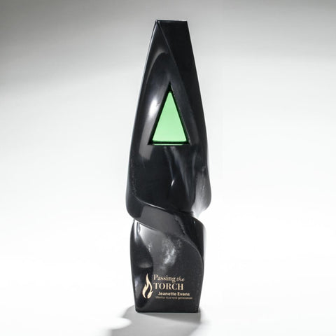 The Colossus is a large, dramatic Stonecast™ obelisk with swirling movement from the bottom to the top of the award. The black marble finish features a cathedral window of either blue or green art glass.