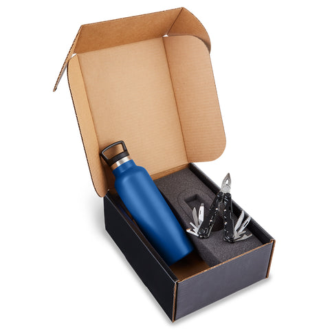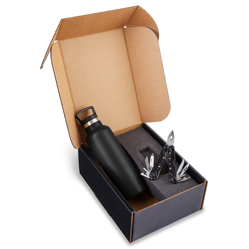 Gift set includes Columbia® Vacuum bottle and Multi-Tool in black kraft gift box. 21 Oz. (621 mL) Columbia® Vacuum bottle is stainless steel double wall insulated with a powder coated finish. Features polypropylene plastic lid with hook that screws on and off for easy drinking. Keeps contents hot 12 Hours, and cold 30 Hours. Wide top opening for adding ice cubes. Hand-wash only. Do not microwave, do not place in freezer. Logo restrictions may apply to this product. Complies with Prop 65. 7.65" W x 11" H x 4" D