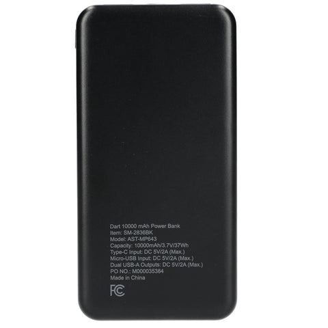 The Dart 10000 mAh Power Bank features a 10,000 mAh/37Wh Grade A lithium ion battery, and LED indicator lights. You can charge up to two devices with a maximum output of 5V/2A, providing convenience and efficiency. This power bank comes with a 39-inch USB-A to Type-C cable that can recharge the battery backup or charge devices with a Type-C input. Power banks are permitted in carry-on luggage only, and at the discretion of TSA agents. Please charge the power bank before initial use. 5.31" D x 2.55" W x 0.55" H
