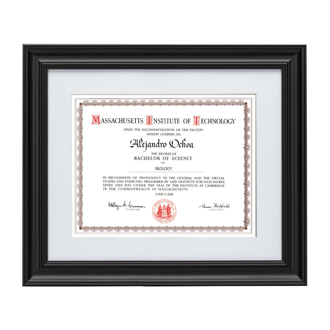 The dignified combination of rich black finished wood and thick white matte displays your certificate with contemporary grace and understated elegance.