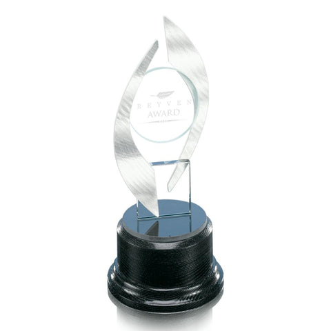 The Delta trophy includes two curved brushed aluminum pieces attached to both a circle and square in polished starfire. The solid oak base is available in natural or black stain.