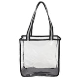 The Diamond Clear TPU Tote has woven balck trim for a contemporary look and is a simple solution for clear bag safety protocols and ensures hassle-free entry to sporting events, concerts, conferences, or festivals. The.reinforced dual woven 23" carry handles have a light gray accent color and the black canvas bottom has a 5-1/4" gusset. Bag is wipeable for easy cleaning and PVC-free. Complies with Prop 65. 12" L x 6" W x 12" H